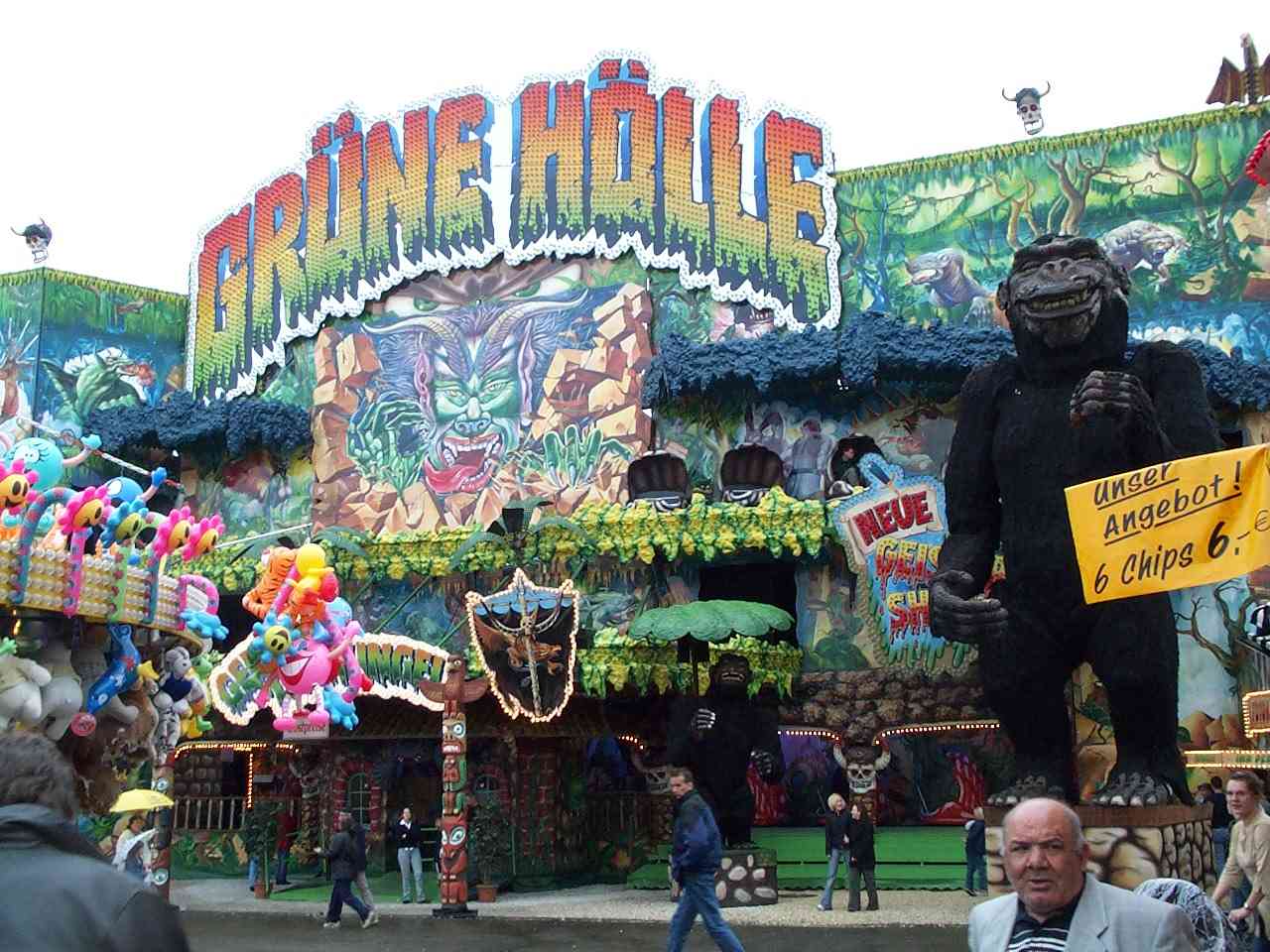 Other rides include an enclosed and dark roller coaster, two bumper-car arenas and one mini-bumper-car-arena, a Ferris wheel, a Merry-Go-Round, and several rides that accelerate your body in various directions. That includes one that tosses two people seated in a cage into the air and bounces them elastically for a minute or so.